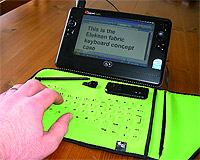 Еще одно творение на тему мобильных клавиатур, появившееся относительно недавно, выглядит гораздо практичнее. Речь идет о матерчатых клавиатурах Wireless Smartphone Keyboard [7] от британской компании Eleksen, которые могут работать под Symbian, Windows Mobile и Palm OS. Компания, кстати, продвигает довольно много устройств на базе «интеллектуального» текстиля (фирменная ткань называется ElekTex). Например, кнопки управления плеером, вшитые во внутренний карман куртки. Фишка в том, что ElekTex оснащена чувствительным и электропроводящим слоями. Клавиатура имеет 63 клавиши буквенная часть с необходимым минимумом дополнительных клавиш работает от пары батареек ААА и подключается к компьютеру по Bluetooth; о наличии соединения информирует зеленый светодиодный индикатор. Длина свернутой в рулон клавиатуры 12 см, вес 65 г. В общем, вполне умещается в сумку или даже в карман. Стоит Wireless Smartphone Keyboard $70.