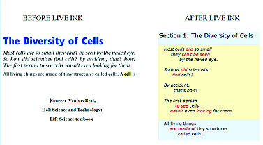 Второй составляющей алгоритма Live Ink является синтаксический анализ текста. Строки разбиваются на фрагменты с учетом структуры предложений, благодаря чему словосочетание (к примеру, существительное и согласуемое с ним прилагательное) занимает одну строку. Также используется знакомый программистам прием визуализации иерархического строения текста с помощью отступов. Например, строка, содержащая причастный оборот, располагается правее определяемого существительного. После такой обработки исходный прямоугольный блок текста превращается в каскад коротких строк, напоминающий знаменитую «лесенку» Маяковского. Дополнительный эффект достигается путем выделения цветом ключевых слов.