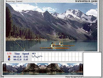 Он управляет скоростью своей лодки с помощью подключаемого к компьютеру "Детектора пульса". Чем реже пульс, тем быстрее участник проходит дистанцию. Скорость соперника задается компьютером исходя из ваших предыдущих достижений.