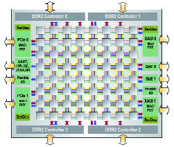 По тому же пути пошел и новичок компания Tilera. Ее гордость процессор Tile64 заслуживает детального рассмотрения. Особенностью чипа является матричная архитектура, объединяющая ядра: в продемонстрированной модели их количество, как видно из названия, достигает 64-х, что, впрочем, не является технологическим пределом. Каждая рабочая ячейка содержит полноценный RISC-процессор (с частотой до 1 ГГц), оснащенный собственным кэшем, и блок, обеспечивающий связь с соседними вычислительными блоками. Такая топология, названная iMesh, открывает возможность перекрестного обмена данными между секциями, что нивелирует действие главного бутылочного горлышка системной шины, не справляющейся с высокой нагрузкой. Разработка Tilera позволяет пропускать между ядрами до 32 терабит в секунду