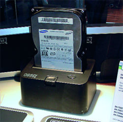 Демонстрировавшиеся до прошлого года включительно прототипы "сменных винчестеров" (общая электроника, сменная механика) как ветром сдуло, зато вместо них появились USB-адаптеры для дисков SATA, представляющие собой "док-станцию" для накопителя - диски в них можно устанавливать примерно так же, как трубку беспроводного телефона на базу, причем есть двухстандартные варианты, предназначенные и для трех-, и для двухдюймовых дисков на выбор пользователя.