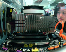 Тепловые трубки победоносно шествуют не только по видеокартам и процессорным кулерам, но и по системным платам, охватывая кроме мостов и преобразователей питания уже и модули памяти (процесс установки последних весьма затруднен, хотя разработчики все же подумали о том, чтобы пользователю не пришлось снимать системную плату при замене модуля памяти).
