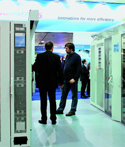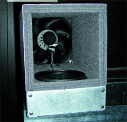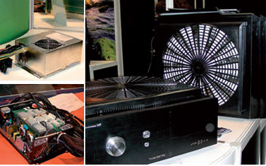 Борьба с шумом в устройствах, где нельзя разместить большие и медленные вентиляторы (в частности, в серверах и шкафах стандартного 19-дюймового формата), ведется иным способом. Интересное решение показала компания Sillentium - Active Noise Comntrol: в воздуховоде размещаются микрофон и динамик, а электронная схема формирует звук в противофазе к создаваемому вентилятором. Как ни странно, даже при таком расположении динамика (логичнее было бы установить его соосно с вентилятором и микрофоном, а не сбоку), уровень подавления весьма высок, хотя полностью шум не исчезает. Демонстрировавшиеся решения были оснащены выключателем, и желающие могли им пощелкать, слушая "чистый" и подавленный шум. Описать результат словами трудно, но по опыту работы с обычными кулерами, разница соответствует двух-трехкратному снижению оборотов вентиляторов. Для одиночного воздуховода компания обещает подавление шума на уровне 10 дБА, а для специального 19-дюймового шкафа - до 20 дБА. Электроника для данного решения представляет собой плату с парой микросхем, а в целом система не требует никакой настройки - параметры автоматически подбираются из условия минимального шума и корректируются при изменении оборотов вентиляторов или даже при изменении положения микрофона. Кроме "тяжелых" серверных решений у разработчиков есть вариант и для десктопов - два пристыковываемых к корпусу бокса, заменяющие передний и задний вентиляторы.