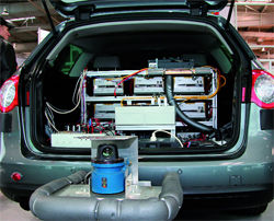 Что же особенного в робоавтомобиле "Люкс"? Прежде всего - внешний вид. В отличие от прочих конкурсантов, густо увешанных разнообразными радарами и сенсорами, этот выглядит как совершенно обычный Passat. Ну разве что, присмотревшись к переднему бамперу, можно заметить справа и слева закрытые темным стеклом "окошки" (еще одно располагается на заднем бампере), да в полу багажника прорезано какое-то вентиляционное отверстие. Собственно, все это и выдает сверхзадачу Ibeo - сделать автономное вождение функцией обычных серийных автомобилей. Ведь не каждый же согласится ездить на машине с размахом антенн в четыре метра и мириться с отсутствием багажника, по крышку забитого умной электроникой.