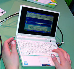 Полезную и легкую железку я увидел почти сразу по прибытии. Обновленную версию Eee PC показал Asus. Получилось у него, как говорят у нас в Рязани, bigger, longer и uncut. В общем, примерно все то же самое, что и в классическом Eee PC 700 (интеловский чипсет плюс SSD), но лучше и больше. Дисплей вырос с семи до почти девяти дюймов, увеличилось и разрешение экрана: теперь 1024х600. Минимальная емкость оперативной памяти составляет 1 Гбайт, тогда как в начальных моделях линейки Eee PC 700 было всего 512 Мбайт. Минимальная емкость SSD - 8 Гбайт, то есть столько же, сколько и в старшей модели Eee PC 700. Интересно, что корпус Eee PC был спроектирован с запасом, так что увеличение экрана не привело к изменению габаритов устройства.