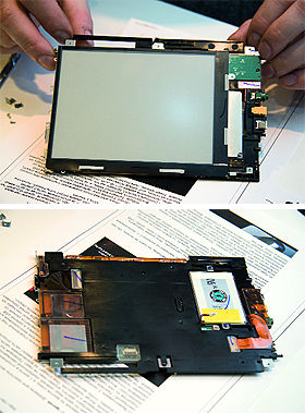 В не особенно сильной и вполне безосновательной надежде (в момент рождения полоски книжка лежала на столе неподвижно: я к ней даже не прикасался), что просто отошел один контактик на шлейфе, я уговорил компьютерровского Левшу, Сергея Леонова (получается, что в этой леденящей душу истории так или иначе приняли участие четыре главных редактора разных лет), разобрать и разобраться, он приехал и сделал чудо: разобрал книжку. Я наблюдал за этим практически цирковым трюком с замиранием сердца: корпус у книжки неразборный, ее потроха запихнуты внутрь с большим натягом Как я и предполагал, все контакты были залиты эпоксидкой (или чем там) насмерть, - так что диагноз был печален: сгорел какой-то транзистор колонки. К тому же он подтвердился описаниями подобных же дефектов PRS-505 в Интернете. Оставалось либо с полоской смириться, либо присовокупить вторую книжку к первой и при оказии переслать в Штаты на ремонт.
