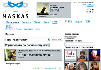 Хоть каждый из нас и является индивидуальностью, порой ну очень хочется выступить от лица кого-нибудь другого. Такой шанс недавно появился благодаря коллективному блогу Maskas. Здесь каждый пользователь, включая незарегистрированных, может примерить на себя любую "личину", начиная с популярных политических фигур и заканчивая абстрактными созданиями человеческого разума. Особенностью сервиса является почти полное отсутствие модерирования, другими словами - откровенный флуд подчищается, а вся остальная работа выполняется самими пользователями с помощью системы рейтинга сообщений. Примечательно, что вы можете подбирать новую маску практически к каждому сообщению: механизм смены "лица"