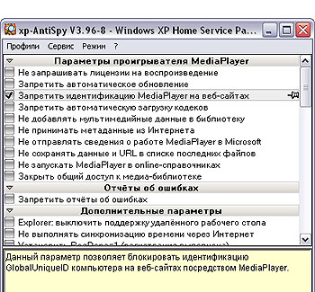Всем хороша Windows XP: надежная, проверенная, привычная в конце концов. Но как и все ее собратья, она содержит массу сервисов, отправляющих сведения о пользователе неизвестно куда. Другими словами, XP выглядит этаким шпионом, без устали вынюхивающим что-то в ваших личных данных. Отчасти исправить ситуацию и взять контроль над системой помогает утилита XP-AntiSpy, позволяющая избавиться от таких нежелательных функций Windows XP, как отправка отчета об ошибках, автозапуск MSN Messenger, идентификация медиаплеера и даже автообновление всей системы. XP-AntiSpy обеспечивает легкий и быстрый доступ к ключам реестра для их удаления или изменения, что способствует очистке ОС от нежелательных процессов и сервисов.