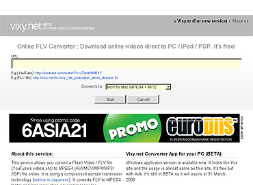 С легкой руки YouTube флэш-ролики разошлись по Сети миллионами. Естественно, появилось и множество сервисов, позволяющих просматривать их на компьютере, да вот незадача: не всякий сервис дает сохранять локальную копию видеоматериала. Онлайновый конвертер Vixy не только поможет решить эту проблему, но и позволит конвертировать клип в более подходящий видеоформат, - достаточно лишь поместить в соответствующее поле ссылку на флэш-ролик и выбрать формат, в который нужно сконвертировать материал (готовый файл загружается на локальный компьютер). Сервис бесплатный, однако придется терпеть рекламный баннер, размещенный на главной странице. Имеется и стационарная версия Vixy, тестовый вариант которой, правда, может работать пока лишь в Windows и Mac OS X. И еще: конвертер из FLV в MPEG4 распространяется под свободной лицензией.