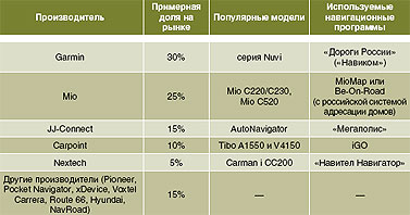 Одна из определяющих характеристик портативных навигаторов - размер экрана. Самую многочисленную группу представляют устройства с диагональю 3,54,3 дюйма, благодаря относительно невысокой цене (от 5 до 15 тысяч рублей) и широкому выбору моделей как от признанных грандов, так и от малоизвестных азиатских производителей (по нашим оценкам, отечественный рынок автонавигаторов выглядит следующим образом, см. таблицу).