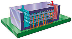 Правда, для чипов нового типа обычные системы охлаждения (радиатор плюс кулер) уже не подойдут, поскольку слои микросхем будут нагревать друг друга изнутри. Поэтому IBM предлагает встраивать в чипы тончайшие каналы, по которым будет прокачиваться вода. Подобно тому, как кровеносная система забирает углекислый газ из каждой клетки тела, водяные капилляры, по диаметру сравнимые с человеческим волосом, будут отводить тепло от всех элементов многослойной микросхемы. Изолировать каналы от компонентов чипа предлагается при помощи кремниевых стенок и слоя диоксида кремния.