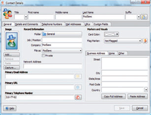 Первичные и вторичные (и третичные) адреса URL и почты, весьма ценная галочка Private, информация по телефонам, адресам; закладка с подробными комментариями, которые заполняются с помощью встроенного полноценного редактора; безграничный список сетевых адресов, так или иначе связанных с данным Контактом; настраиваемые маркеры индивидуальной карточки (цвет, флаг и т. п.); а также возможность кастомизировать интерфейс базы данных по Контактам до бесконечности, фиксируя в учетной карточке, скажем, цвет глаз, волос, вес, рост, родственные отношения (жена, брат и т.п.) и вообще все, что только ваша душа пожелает.