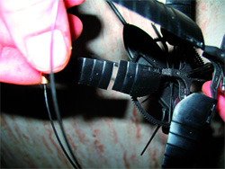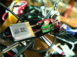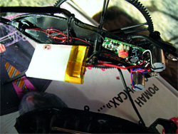 Отремонтировать неликвидный вертолет особой надежды не было, но для начала я установил его на зарядку. Реакция нулевая, "глаза" не загорались. Блок питания и пульт управления, похоже, были живы - второй "Комар" реагировал на управляющие сигналы с некондиционного пульта. После вскрытия насекомого был поставлен обнадеживающий диагноз: дырка в аккумуляторе. Еще летом на Митинском рынке я купил три подобных аккумулятора на 180 мАч, а перепаять пару контактов было минутным делом. О чудо, "Комар" замигал светодиодными глазками. Нормально летать на новом аккумуляторе он не захотел, поднимался не выше 20 сантиметров, но все же летал.