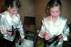 6. Дочь разбирает комплект вертолета: сам вертолет, пульт управления, антенна к пульту, батарейка к пульту, микроотвертка, зарядное устройство и запасной хвостовой винт