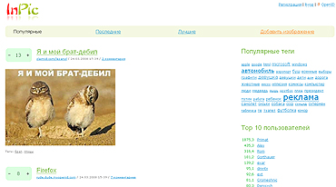 Возьмем, к примеру, веб.сервис InPic. Все до банальности просто: любой зарегистрированный пользователь может выкладывать здесь картинки, показавшиеся ему заслуживающими внимания. Остальные посетители могут оставлять комментарии или голосовать в системе рейтинга изображений. Вот, в общем-то, и все, что можно сказать о сервисе, но несмотря на кажущуюся легкость и "недоделанность" проекта по сравнению с гигантскими фотогалереями, перегруженными рюшечками и малоиспользуемыми