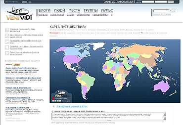 Где, как не в Интернете можно разузнать о странах и континентах, а также о заповедных уголках планеты, еще не испорченных цивилизацией? Одним из кладезей такого рода информации является веб.сервис VeniVidi. Здесь будущий путешественник не только найдет отзывы о манящих его краях, но и сможет заказть авиабилеты и забронировать гостиничные номера. На портале, кстати, можно рассказать о собственных странствиях (для этого имеется система блогов и карта посещенных мест на планете), а также вступить в переписку с собратьями по увлечению.