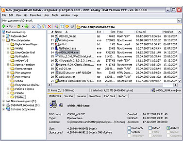 Проводник Windows стал таким привычным, что мы редко задумываемся об альтернативах. Меж тем более функциональные альтернативы существуют, - например, программа XYplorer. Многостраничный интерфейс, снабженный системой табов, развитая система поиска, возможность предпросмотра различных мультимедийных файлов, редактирование MP3-тегов - вот лишь малая часть возможностей этого небольшого, но работящего приложения. В арсенале XYplorer есть средства визуализации (вроде цветового выделения папок), повышающие комфортность работы, а также мощные фильтры, облегчающие сортировку большого количества данных. Самым частым действиям можно назначить собственные команды.