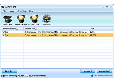 Работа с архивами и образами дисков на первый взгляд кажется рутинным занятием. Распаковка, редактирование, компрессия - все, как обычно. Но это только на первый взгляд. На самом деле процесс можно кардинально изменить, воспользовавшись программой WinMount. Она позволяет практически из любого архива или файла образа создавать виртуальные диски и работать с вложенными файлами без утомительной распаковки. Вы сможете вносить изменения, добавлять и удалять данные, а по окончании работы архив или файл образа будет автоматически обновлен. Поддерживаются множество форматов образов, а также архивы ZIP и RAR. В ближайшем будущем ожидается добавление новых возможностей, в том числе обработка образов VMWare и архивов ARJ и ICE.