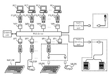 Представленное в заявке устройство напоминает банальный KVM-переключатель, позволяющий использовать один набор клавиатура/мышь/монитор/аудио для работы с несколькими компьютерами. Однако здесь есть интересное дополнение: предлагается сделать не просто переключатель с одного набора устройств ввода/вывода на несколько компьютеров, а коммутирующую матрицу, к которой можно подключить несколько комплектов ввода/вывода с тем, чтобы произвольно подключать их к нужным компьютерам.