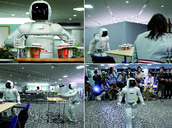 Рождественские каникулы у близнецов Asimo выдались горячими: на протяжении целого месяца им было доверено нести вахту в токийской штаб-квартире Honda. Проводя очередного посетителя к креслу в зале ожидания, роботы сканировали его визитную карточку, оповещая начальство о прибытии очередного "мистера X", после чего переквалифицировались в официантов, выполняя заказы на соки и коктейли. Думается, что на цокольном этаже эти малютки надолго не задержатся: по мере повышения квалификации своих детищ Honda устроит их на куда более престижную работу. ДК