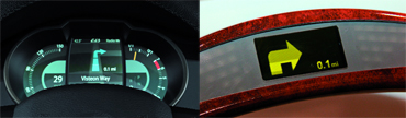 подсказки. Правда, об удобстве такого решения можно поспорить: и руль не всегда находится в нейтральном положении, и перевод взгляда с дороги на столь близко расположенный объект занимает немало времени. В этом отношении задумка Visteon, чей инструментальный кластер содержит трехмерный дисплей, смотрится получше. Навигатор располагается посередине, между спидометром и тахометром, причем стрелки указателя поворота, улучшая восприятие, как бы парят над картой.