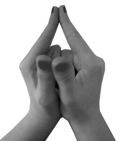3. Подогните внутрь ладоней мизинцы, безымянные и средние пальцы. Теперь каждый из этих пальцев соприкасается с тем же пальцем другой руки средними фалангами.