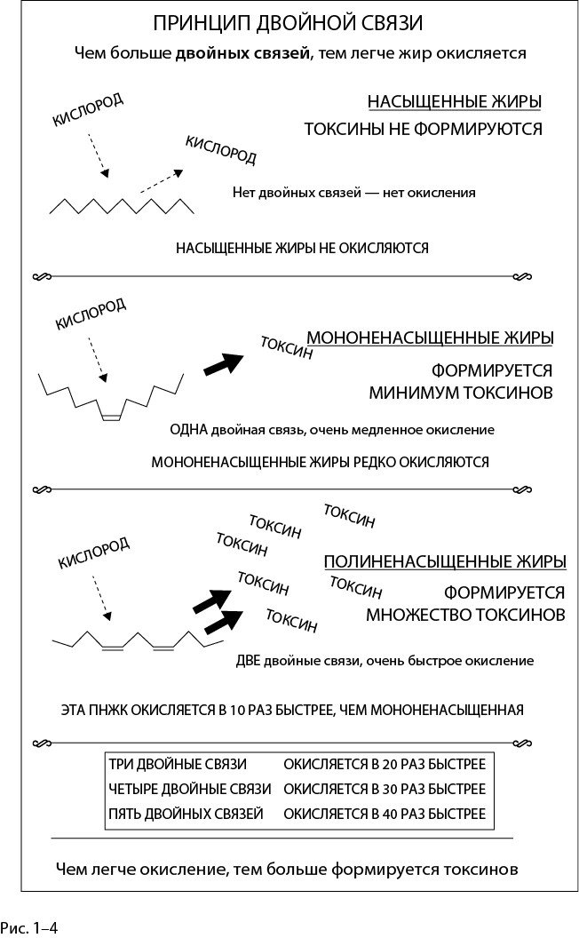 Чтобы облегчить понимание относительной токсичности различных пищевых жиров, можно воспользоваться принципом двойной связи. Количество двойных связей в жирной кислоте говорит нам, насколько легко она окисляется. Чем двойных связей больше, тем она окислится быстрее. А если двойные связи еще и находятся близко друг к другу, как в ПНЖК, это еще более серьезная проблема. Поскольку окисление создает токсины, буквально каждая молекула ПНЖК может стать потенциальным источником токсинов. По сравнению с животными жирами и жирами из традиционных масел для готовки, например оливковым или кокосовым, в растительных маслах намного больше близкорасположенных двойных связей и, соответственно, в них может образовываться намного больше ядовитых веществ при контакте с кислородом. На рис. 14 изображена сравнительная уязвимость разных типов жирных кислот к окислению.