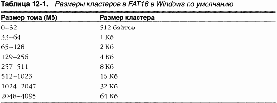 FATl6 за счет 16-разрядных идентификаторов кластеров может адресовать до 216 (65 536) кластеров. B Windows размер кластера FATl6 варьируется от 512 байтов до 64 Кб, поэтому размер FATl6-TOMa ограничен 4 Гб. Размер кластеров, используемых Windows, зависит от размера тома (таблица 12-1). Если вы форматируете том размером менее 16 Мб для FAT с помощью команды format или оснастки Disk Management (Увправление дисками), Windows вместо FATl6 использует FAT12.