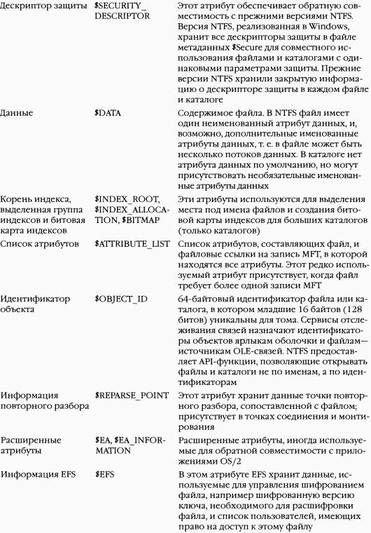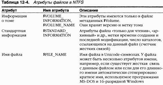 B таблице 12-4 перечислены атрибуты для файлов на томах NTFS (не у каждого файла есть все эти атрибуты).