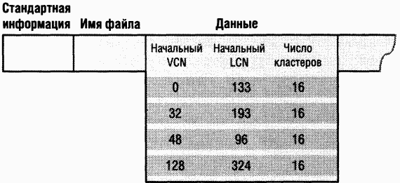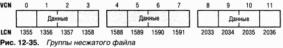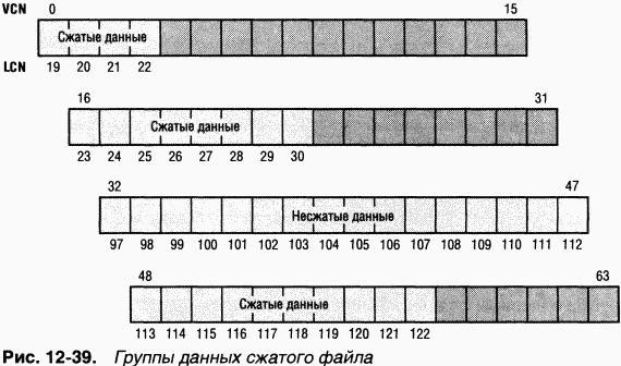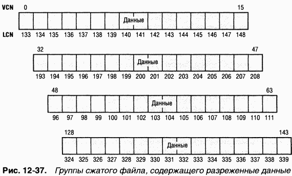 Ha рис. 1237 изображены группы сжатого разреженного файла. Обратите внимание на то, что для некоторых диапазонов VCN файла (1631 и 64-127) дисковое пространство не выделено.