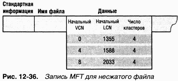 Данный файл хранится в трех группах, каждая по 4 кластера, и таким образом занимает 12 кластеров. Запись MFT для этого файла представлена на рис. 1236. Как мы уже отмечали, для экономии места на диске атрибут данных в записи MFT содержит только одно сопоставление VCN-LCN для каждой группы, а не для каждого кластера. Тем не менее каждому VCN от 0 до 11 сопоставлен свой LCN. Первый элемент начинается с VCN 0 и охватывает 4 кластера, второй начинается с VCN 4, также охватывая 4 кластера, и т. д. Такой формат типичен для несжатого файла.