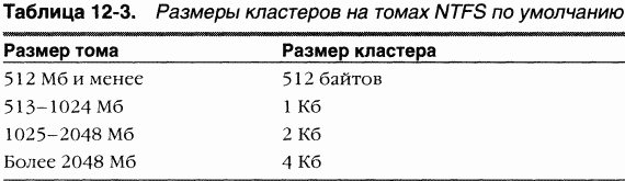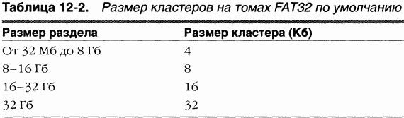 более новая файловая система на основе формата FAT; она поддерживается Windows 95 OSR2, Windows 98 и Windows Millennium Edition. FAT32 использует 32-разрядные идентификаторы кластеров, но при этом резервирует старшие 4 бита, так что эффективный размер идентификатора кластера составляет 28 бит. Поскольку максимальный размер кластеров FAT32 равен 32 Кб, теоретически FAT32 может работать с 8-терабайтными томами. Windows ограничивает размер новых томов FAT32 до 32 Гб, хотя поддерживает существующие тома FAT32 большего размера (созданные в других операционных системах). Большее число кластеров, поддерживаемое FAT32, позволяет ей управлять дисками более эффективно, чем FATl6. FAT32 может использовать 512-байтовые кластеры для томов размером до 128 Мб. Размеры кластеров на томах FAT32 по умолчанию показаны в таблице 12-2.