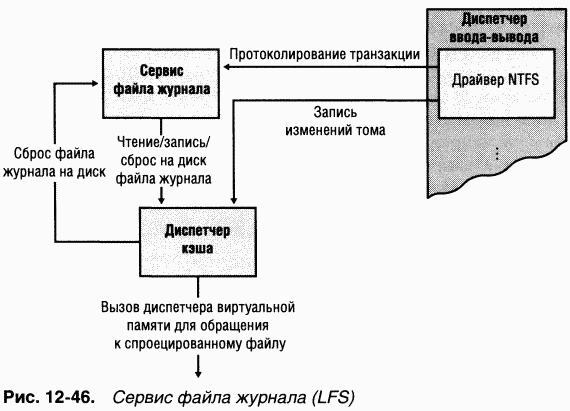 NTFS никогда не выполняет чтение/запись транзакций в журнал напрямую. LFS предоставляет сервисы, которые NTFS вызывает для открытия файла журнала, помещения в него записей, чтения записей из журнала в прямом и обратном порядке, сброса записей журнала до заданного LSN или установки логического начала журнала на больший LSN. B процессе восстановления NTFS вызывает LFS для чтения записей журнала в прямом направлении, чтобы повторить все транзакции, которые запротоколированы в журнале, но не записаны на диск в момент сбоя. NTFS также обращается к LFS для чтения записей в обратном направлении, чтобы отменить (или откатить) все транзакции, не полностью запротоколированные перед аварией системы, и установить начало файла журнала на запись с большим LSN после того, как старые записи журнала стали не нужны.