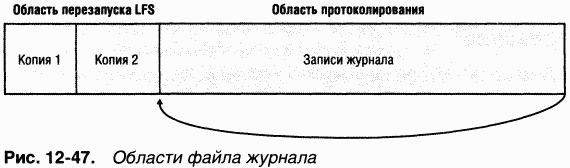 LFS делит файл журнала на две части: область перезапуска (restart area) и «безразмерную» область протоколирования (logging area) (рис. 1247).