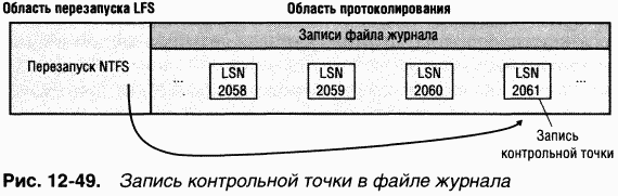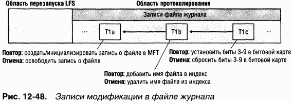 Информация для отмены (undo information) Описывает, как обратить изменения, вызванные одной подоперацией транзакции, которая в момент сбоя была запротоколирована лишь частично. Ha рис. 1248 показаны три записи модификации в файле журнала. Каждая запись представляет одну подоперацию транзакции, создающей новый файл. Информация для повтора в каждой записи модификации сообщает NTFS, как повторно применить данную подоперацию к дисковому тому, а информация для отмены как откатить (отменить) эту подоперацию.