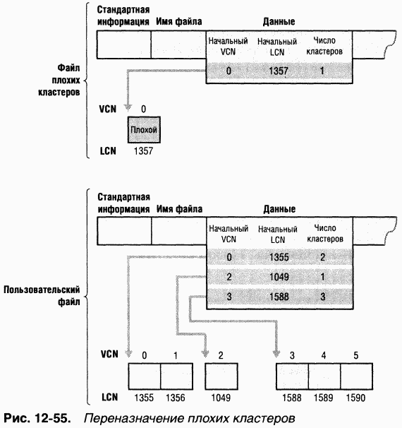 Это предотвращает повторное выделение данного кластера другому файлу. Затем NTFS выделяет новый кластер и изменяет сопоставление VCN-LCN для файла так, чтобы оно указывало на этот кластер. Данная процедура, известная как переназначение плохого кластера (bad-cluster remapping), иллюстрируется на рис. 1255. Кластер номер 1357, содержащий плохой сектор, заменяется новым кластером с номером 1049.