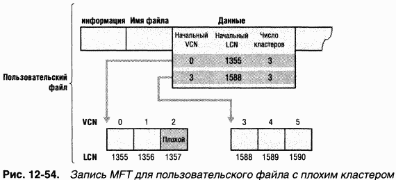 Ha рис. 1254 показана запись MFT для пользовательского файла, в одном из групп которого имеется плохой сектор. Когда NTFS получает ошибку, связанную с плохим сектором, она присоединяет содержащий его кластер к своему файлу плохих кластеров.