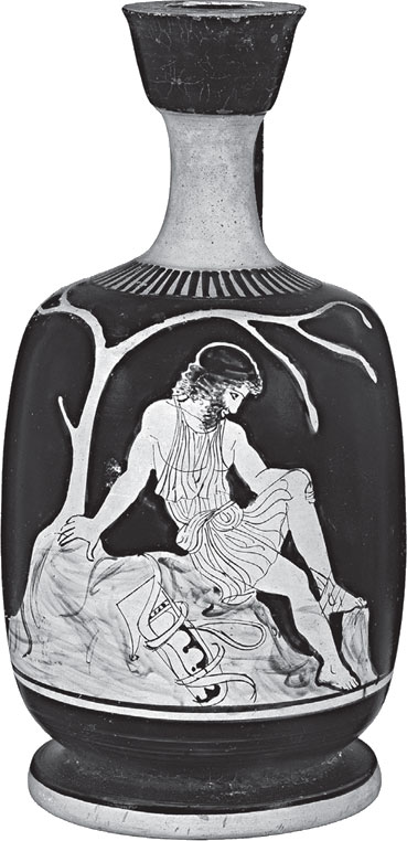 Рис. 5. После того, как Филоктет случайно поранился стрелой, отравленной ядом гидры, товарищи оставили его на пустынном острове. Злополучный лучник сидит на скале под мертвым деревом, с забинтованной стопой и колчаном отравленных стрел. Сосуд для масла, 420 г. до н. э., Метрополитен-музей, Нью-Йорк