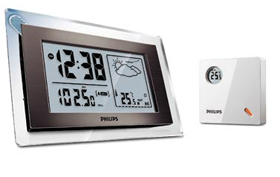 Авторы: Михаил Карпов, Салтыков Павелмодулем, умеющим измерять температуру воздуха за окном. Плюс ко всему он оснащен проектором, благодаря которому можно видеть точное время и погоду, скажем, на стене спальни. Так вот буквально на днях в продаже появилось аналогичное устройство от Philips. Называется оно AJ260, и к нему тоже прилагается беспроводной уличный датчик метеоусловий. Проектора в него производитель встраивать не стал, зато оборудовал будильник ярким цветовым индикатором, который меняет цвет в зависимости от того, что творится за окном. Когда индикатор янтарного цвета - значит на улице солнечно, синего - облачно, фиолетового - моросит дождь и т. д. К тому же устройство демонстрирует графические анимированные погодные пиктограммы на своем дисплее. Наконец, это еще и радиобудильник, работающий в FM-диапазоне и самостоятельно выставляющий точное время по европейскому сигналу DCF77. Интересно, какая компания еще сподобится выпустить погодник? В необходимости подобных гаджетов мы не сомневаемся - если даже у электронных фоторамок есть свой покупатель