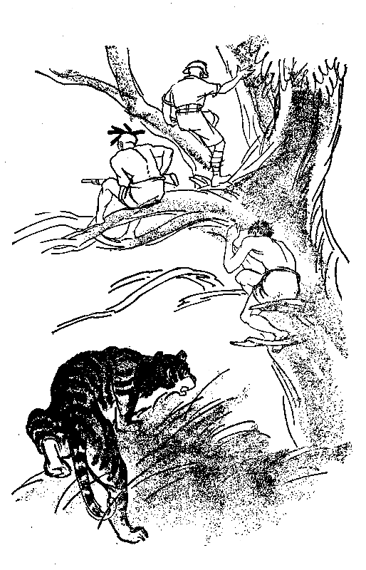 Жуткий звериный рев прорезал ночь. Хищник вскочил еще раз, но тут уже и Пип послал свою пулю. А сверху на тигра струей лилась кровь Хаона. Когда несчастного сняли с дерева и осмотрели рану, оказалось, что тигр вырвал у него из ноги кусок мяса. Рана была большая, страшная, но жизни проводника не угрожала.