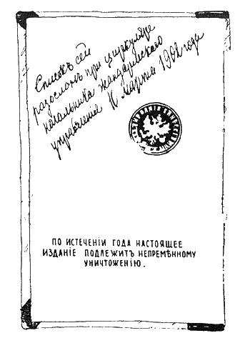 «Список сей разослан при циркуляре начальника жандармского управления 10 марта 1902 года». А пониже жирными буквами напечатано: «По истечении года настоящее издание подлежит непременному уничтожению».