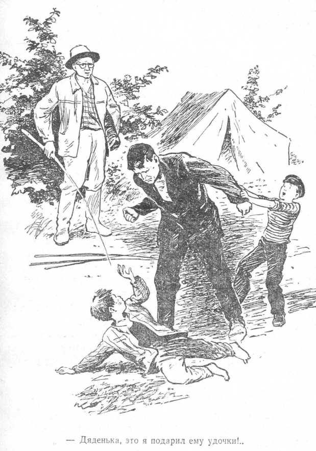Рыбак спокойно выслушал его и, не вымолвив ни слова, пошёл к палатке. Трошку, сонного, выволок за ногу из палатки и сказал, заскрипев зубами: