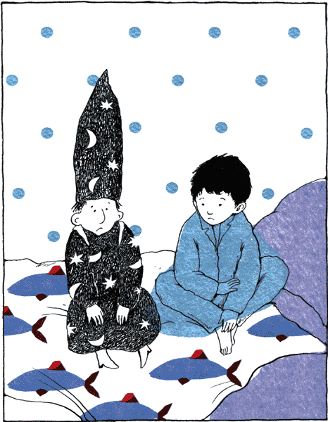 Мальчик и волшебник остались одни. Они молча ждали, пока родители усядутся у телевизора. В щель под дверью просачивался голубоватый свет экрана и доносилась тревожная дробь музыкальное сопровождение вечернего триллера.