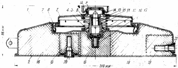 1 корпус; 2 дно; 3 запальный стакан; 4 втулка; 5 нажимная крышка; 6 опорное кольцо; 7 резиновое кольцо; 8 пружина нажимной крышки; 9 резьбовая пробка; 10 резиновая прокладка; 11 корпус взрывателя; 12 капсюледержатель; 13 ударник; 14 чека ударника; 15 боевая пружина; 16 соединительная муфта; 17 капсюль-детонатор; 18 заряд ВВ (аммотол); 19 промежуточный детонатор (ТЭН); 20 гнездо для донного взрывателя; 21 гнездо для бокового взрывателя