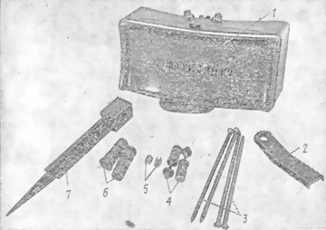 1 мина; 2 рукоятка; 3 гвозди; 4 штанги; 5 втулки; 6 футляры; 7 штырь