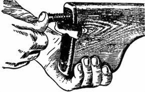 руки или отверткой нажать на стержень возвратного механизма (в затыльнике приклада) вперед до отказа; повернуть стержень на ¼ оборота против хода часовой стрелки и вынуть из приклада возвратный механизм (рис. 4). При отделении возвратного механизма следить, чтобы затворная рама была спущена с боевого взвода.