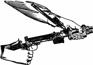 2) Отделить шомпол. Обхватить шомпол у кронштейна левой рукой и отжать его, затем правой рукой вынуть назад.