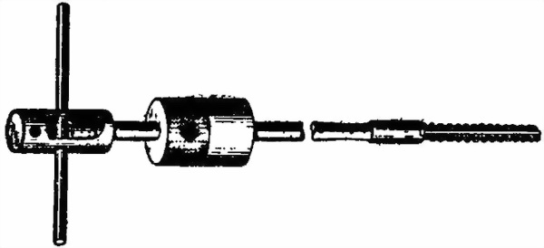 4) Прочистить канал ствола. Положить пулемет в вырезы стола для чистки оружия или на обычный стол, а при отсутствии стола пулемет положить на чистую подстилку. Сложить паклю в виде цифры 8, перекрестие «восьмерки» наложить на конец протирки и уложить волокна пакли вдоль стержня протирки; при этом концы пакли должны быть короче стержня протирки, а толщина слоя должна быть такой, чтобы протирка с паклей вводилась в канал ствола небольшим усилием руки. Пропитать паклю щелочным составом (налить на паклю немного щелочного состава и пальцами рук слегка помять паклю). Ввести шомпол с протиркой в канал ствола и укрепить на стволе дульную накладку. Одной рукой удерживая пулемет, а другой рукой взявшись за вороток и шомпольную муфту,