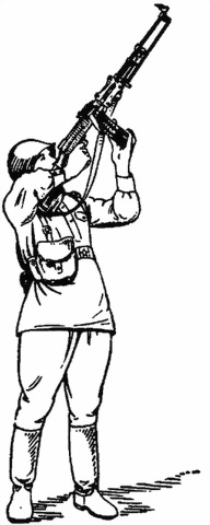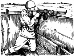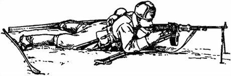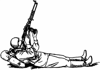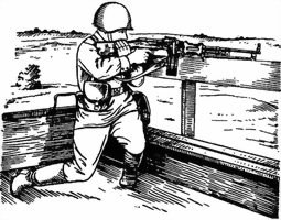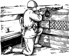 Стоя с установкой сошки пулемета на бруствер (берму) траншеи (рис. 63). Пулемет, установленный сошкой на бруствер (берму) траншеи, удерживается правой рукой за пистолетную рукоятку, левой за шейку приклада. Для придания пулемету необходимого угла возвышения пулеметчик приседает или приподнимается. Изменение направления пулемета при стрельбе достигается перемещением корпуса пулеметчика в нужную сторону.