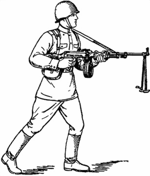 130. Для стрельбы с короткой остановки остановиться в момент постановки левой ноги на землю, одновременно принять положение для стрельбы стоя (рис. 52); левой рукой направить пулемет в цель и, прижав приклад к правому боку, произвести одну две очереди; затем продолжать движение. Кроме того, при необходимости пулеметчик принимает положение для стрельбы стоя или с колена с упором приклада в плечо, как указано в ст. 117.